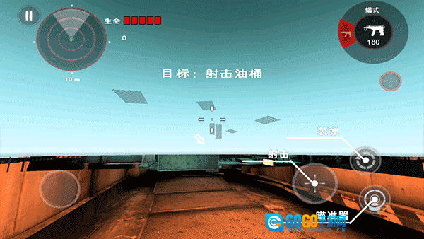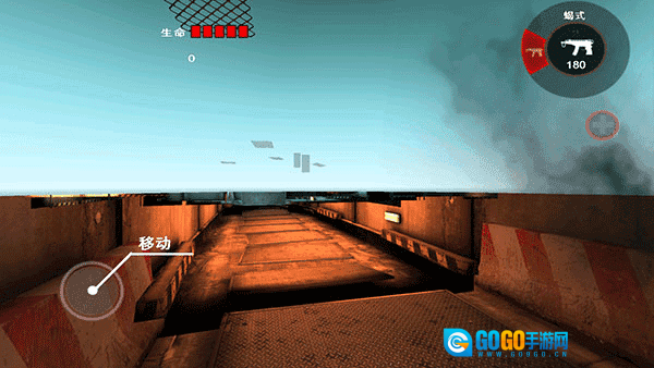 3、位于左下角的按钮是移动按键,左侧上方设有小地图雷达,它能显示僵尸与自身的距离。右侧上方则会显示弹量以及提供切换武器的功能。在此特别说明,一旦主武器的弹量耗尽,系统会自动将武器切换至副武器。