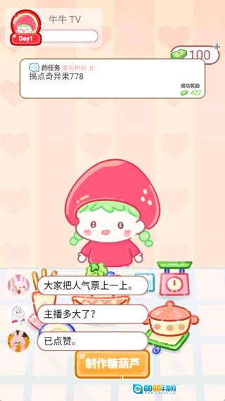 1、玩家一旦开启直播,即可着手制作糖葫芦。按照观众提出的要求,制作出各种不同口味的糖葫芦,以此提高直播间的人气。