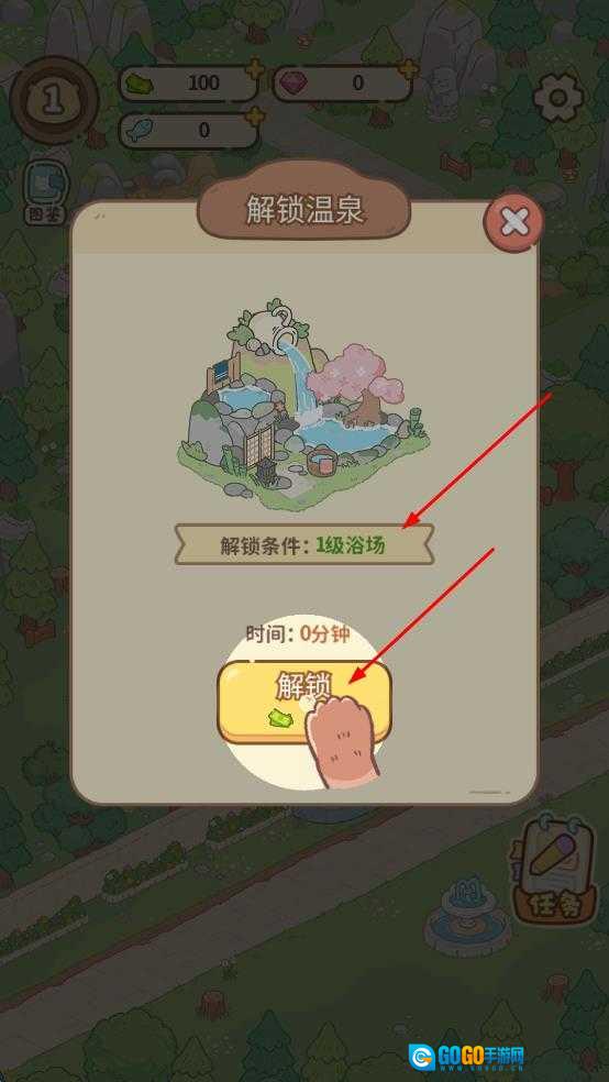 2、当达到1级浴场条件时,点击解锁温泉,通过消耗资源来拓展浴场设施,使经营内容更为丰富。