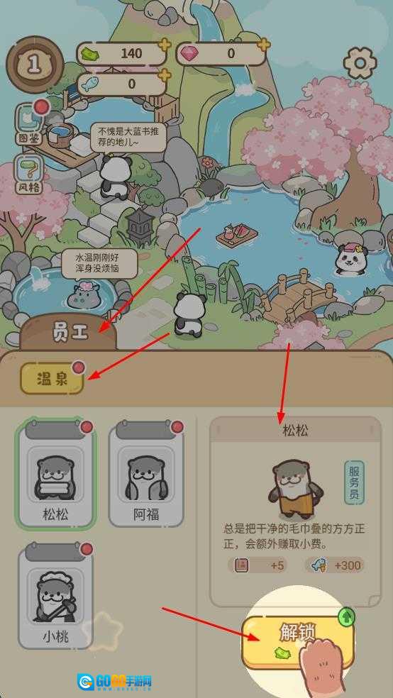 4、于员工界面解锁松松,当松松担任服务员时,可凭借叠毛巾这一行为额外赚取小费,进而提高浴场的收益效率。
