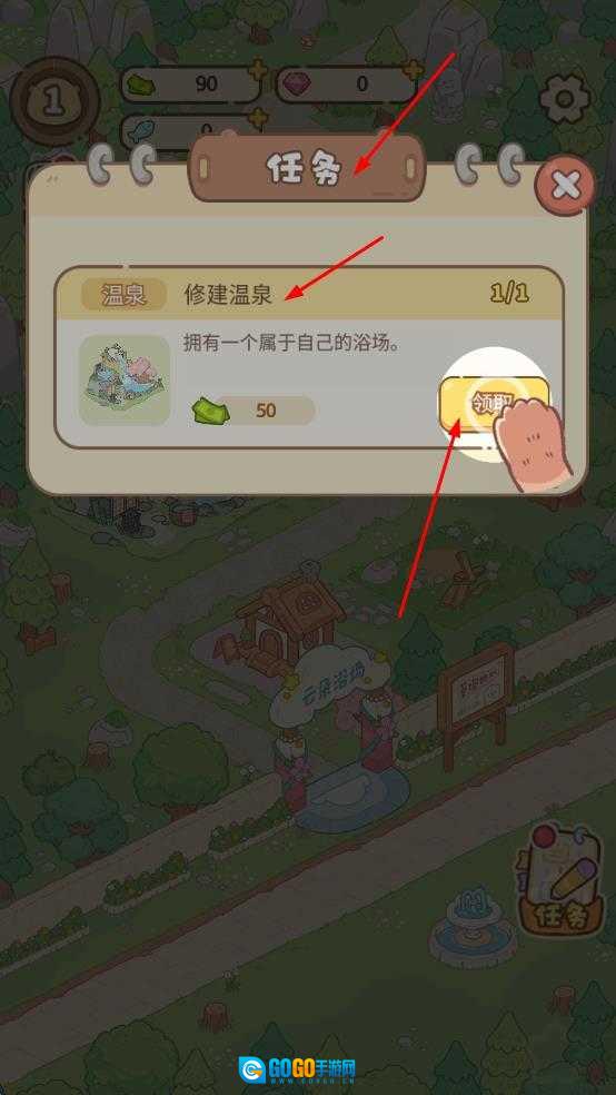 3、顺利完成温泉修建任务后,要尽快领取50金币的奖励,通过这样积累资金,以便用于浴场的升级以及新建筑的解锁。