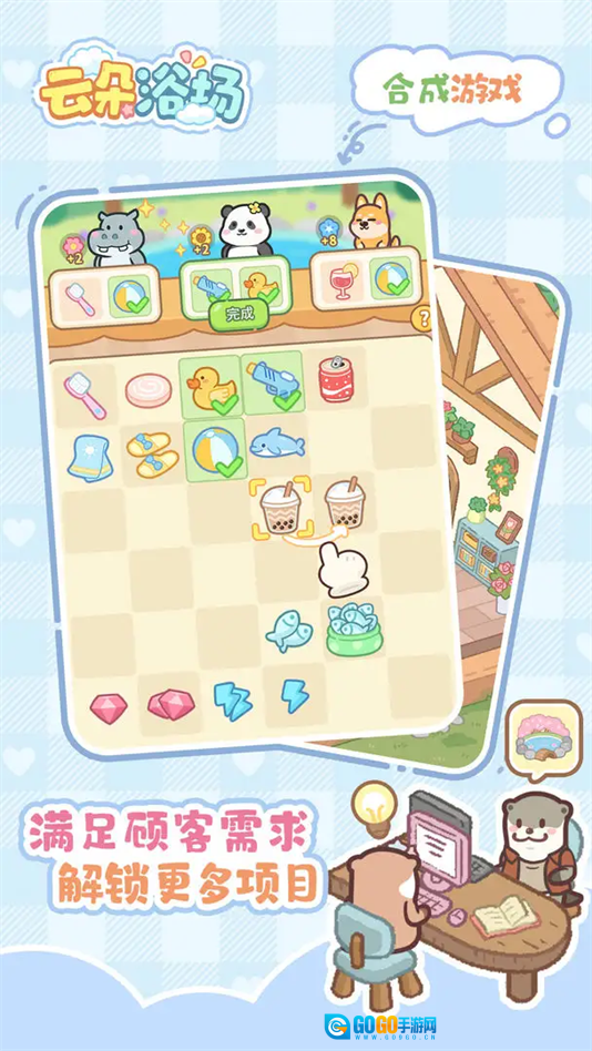 云朵浴场是一款颇具趣味的模拟经营游戏,采用Q萌可爱的卡通画面风格。在游戏中,玩家将扮演接手一家历史悠久浴场的水獭,需要精心为每位顾客做好布置,满足小动物们的需求,如此便能触发剧情,获得的奖励还能助力浴场不断发展,变得越来越好。