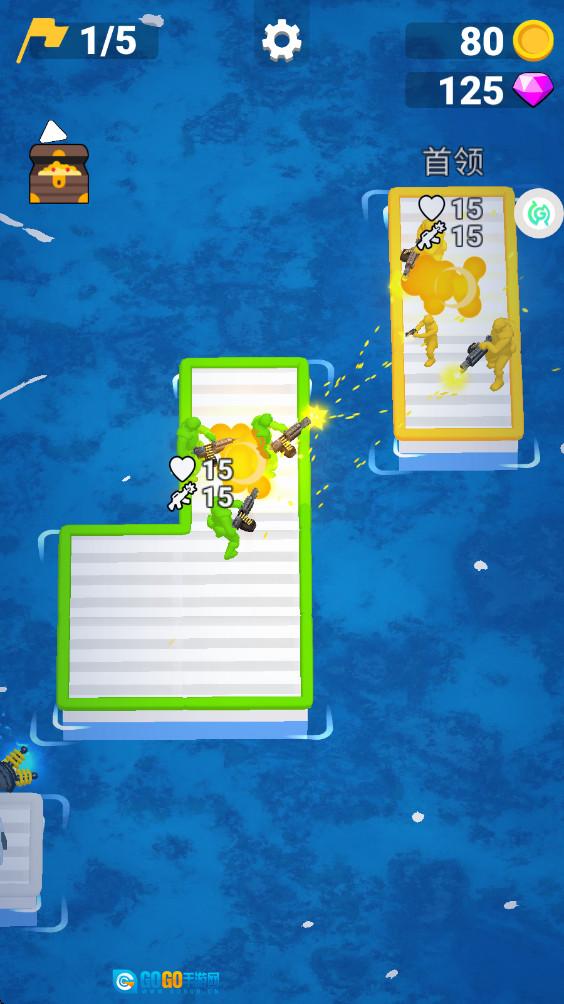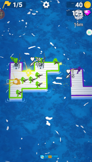 2. 操控木筏在海洋中行进,收集海面漂浮的金币与钻石,以此来建造射击塔,对敌方敌人展开攻击。