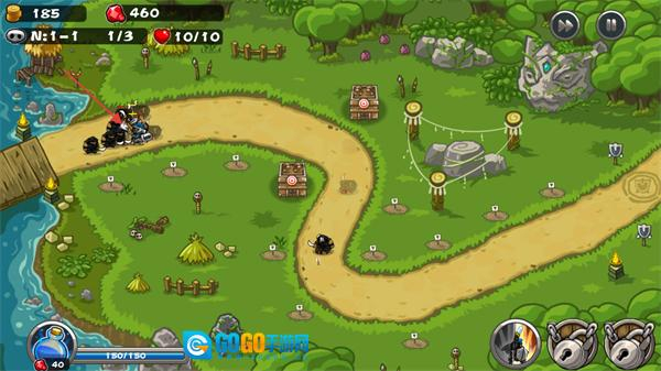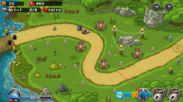 2. 点击战线旁的土堆开展建造,耗费金币来搭建箭塔。