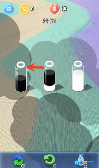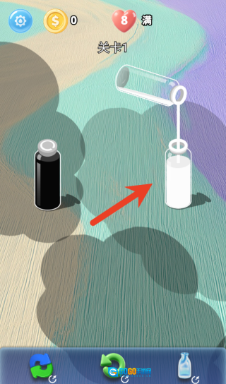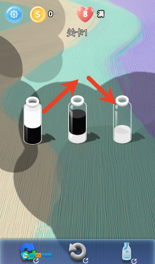1. 借助手指操作,把不同颜色的液体在各个瓶子之间进行倾倒,直至每个瓶子里都只留存一种纯色。