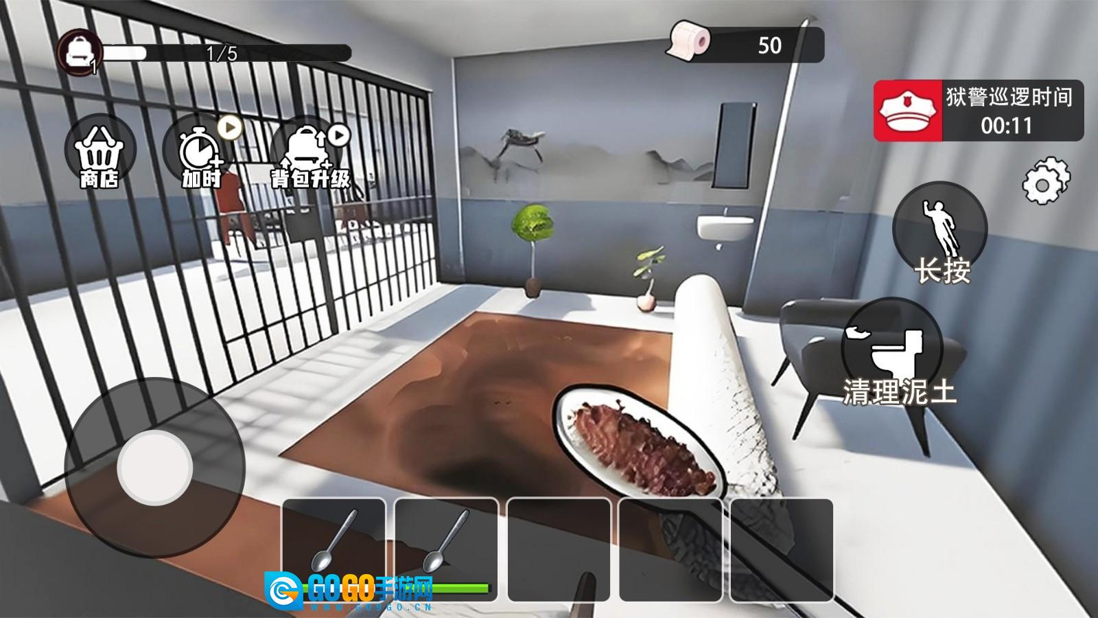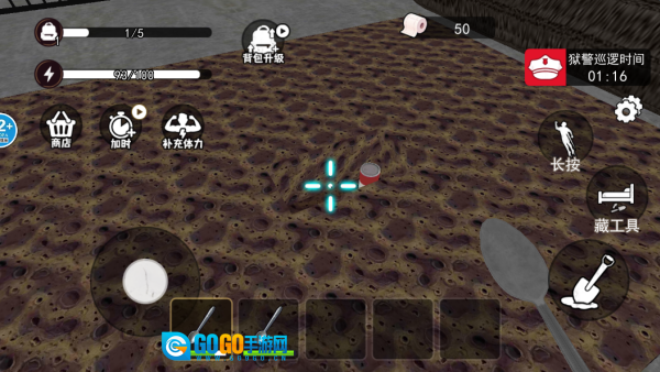 4. 接下来,你能够把地毯卷起来,点击右侧的铁锹图标,借助饭勺进行挖地操作。在此过程中,你务必留意狱警巡逻的倒计时,要在狱警到来之前停下挖掘动作。