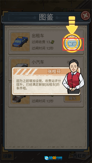3、完成设施升级并提升评分后,点击【解锁】出租车。此时,出租车过闸收费为【13】,过闸时间为【12】秒,以此增强收费能力。