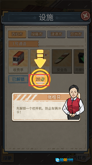 2. 于【设施】界面,耗费【20】绿钞开启【栏杆机】,以此阻拦车辆冲卡,维护收费站的秩序。