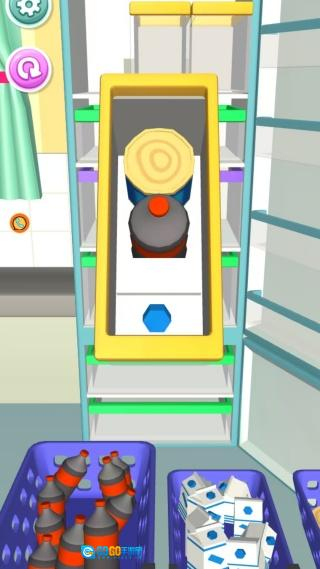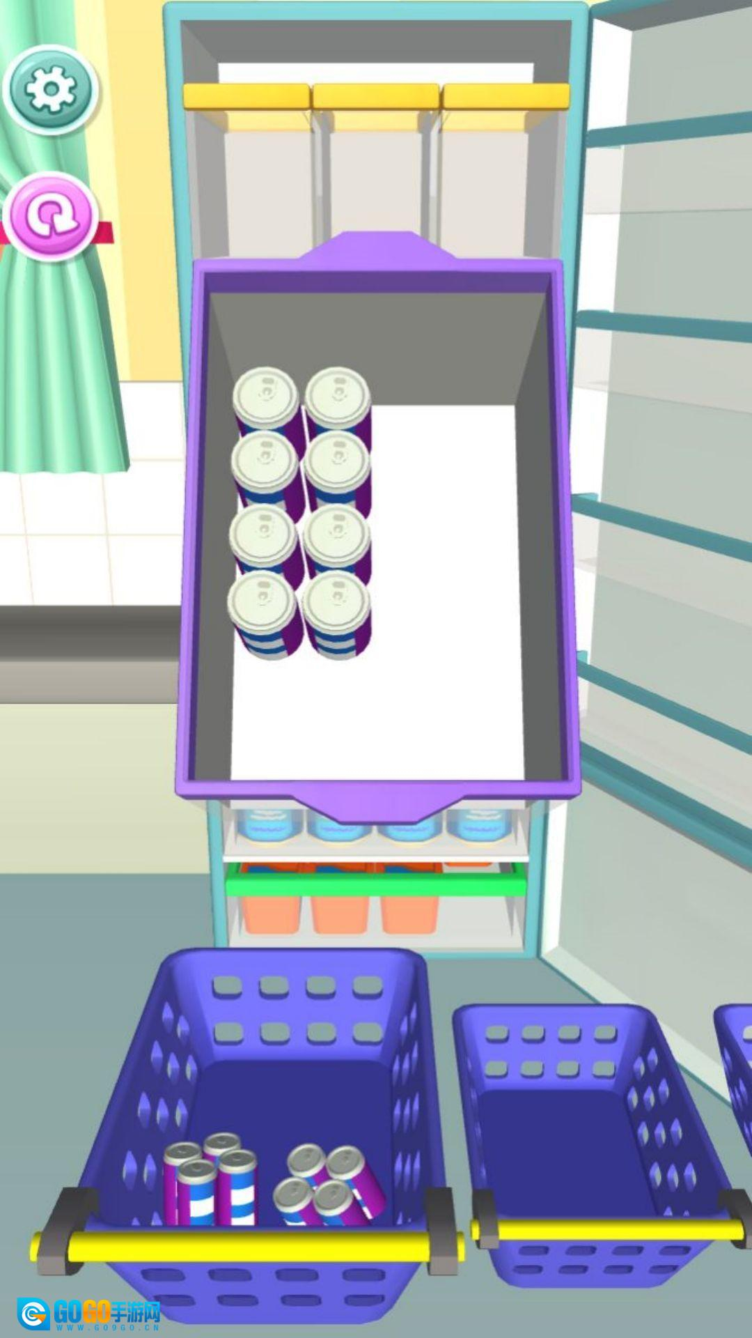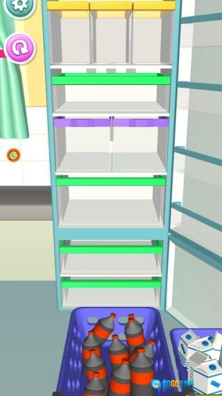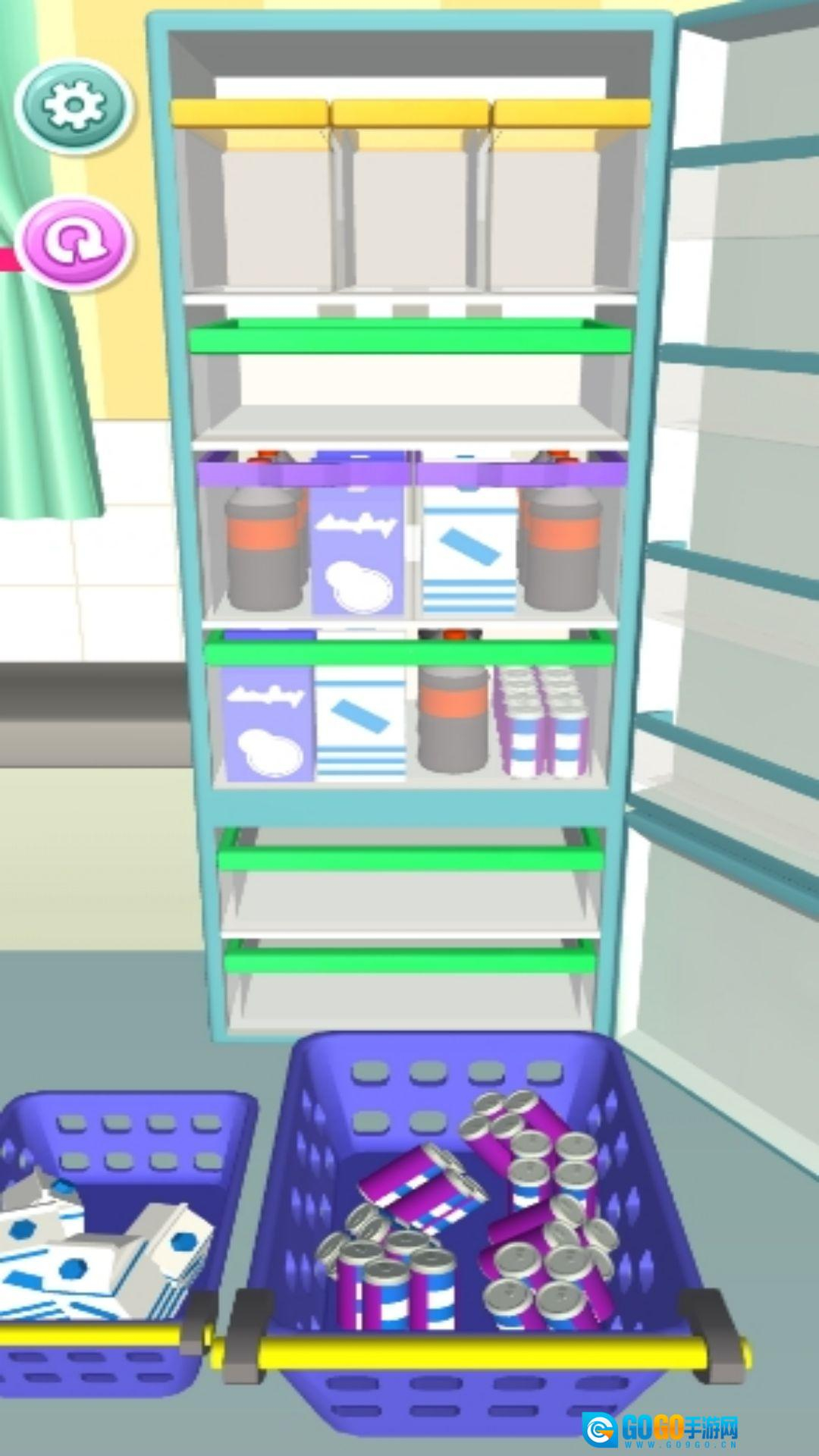 2、依据不同关卡的盒子种类,对冰箱空间进行合理规划,把物品有条不紊地放入盒子和冰箱中,完成收纳后就能解锁下一关。