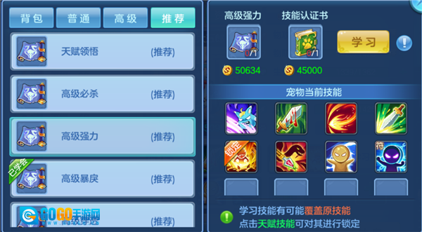 言归正传,我的办法是先依据自身护符,给宠物打敏捷、防御、英勇这类价格较为便宜的技能书。一来成本低,即便打书失败掉了也不心疼;二来这些技能实用性很强。打完这些便宜的书后,再考虑上价格昂贵的技能书。就好比六技能的月光宠物,先将6个技能格填满,之后再上最为昂贵的那本技能书。假设最后要上的是必杀技能书,除了连击技能外,其他技能无论顶掉哪一本都可以。当然,成功顶掉指定技能的概率仅有六分之一。