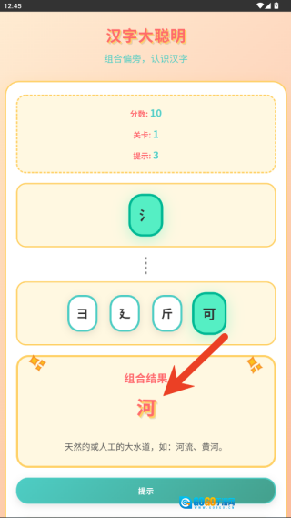 3、玩家若觉得已将偏旁部首准确组合成目标汉字,点击提交按钮,系统会即刻判断,组合无误便通关,同时给予积极反馈。