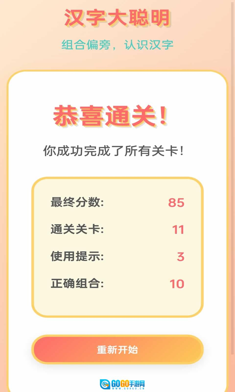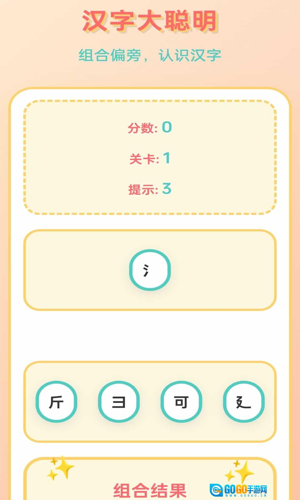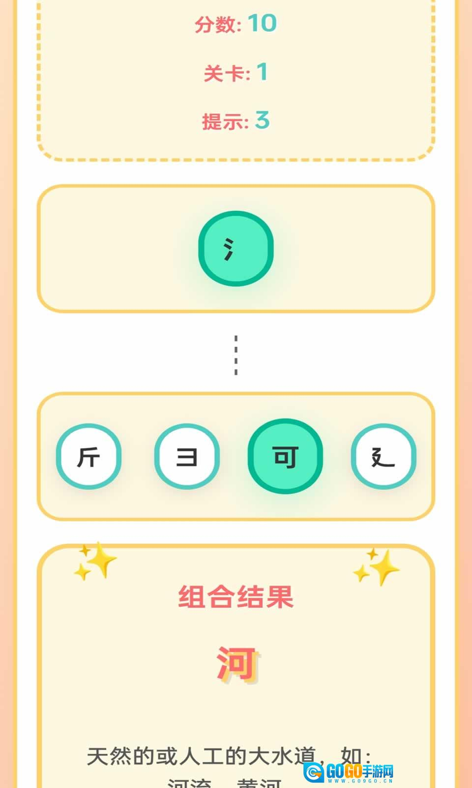 3、当成功组合出正确的汉字时,就能顺利通过关卡,同时还可获得对应的星星奖励。