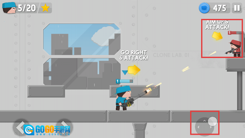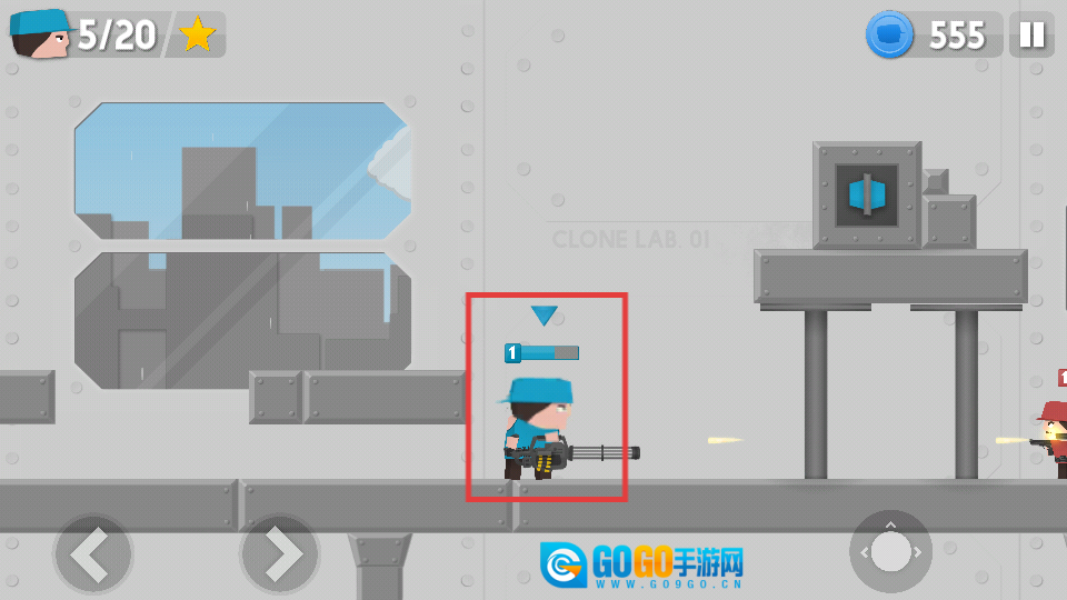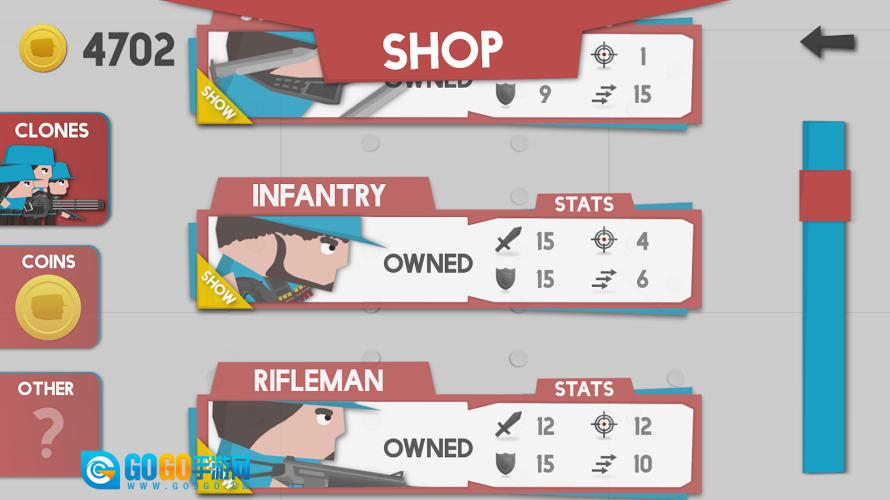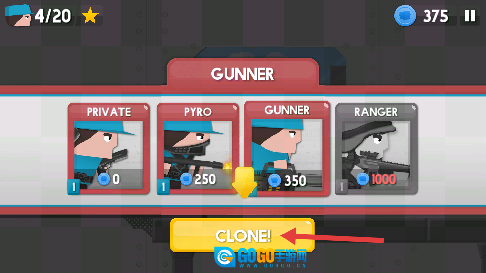 1. 选中【GUNNER】单位,点击【CLONE!】,生成此单位,增强战力。