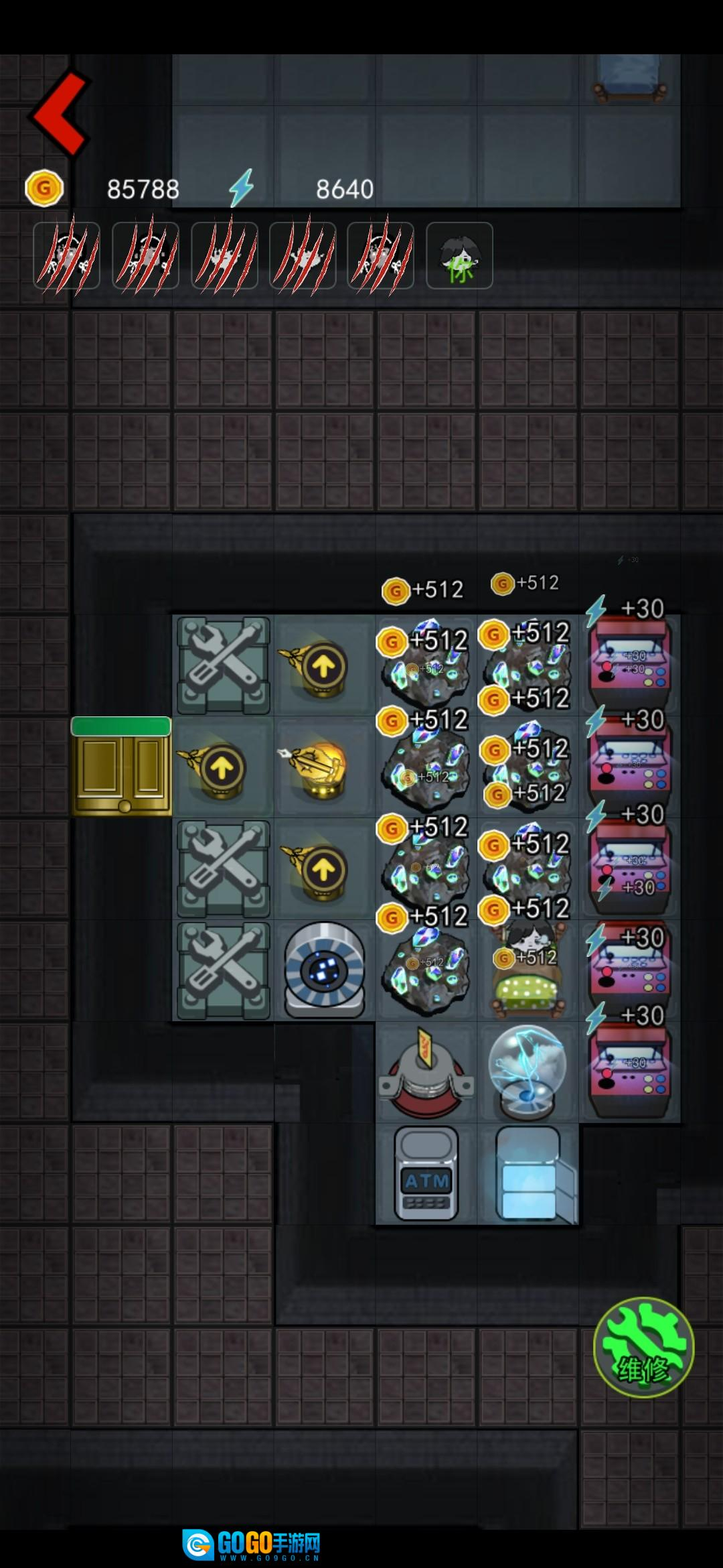 2、从初始状态起步,通过获取金币来对门、炮台以及游戏机等道具进行升级,这些升级后的道具能够助力你抵御猛鬼。