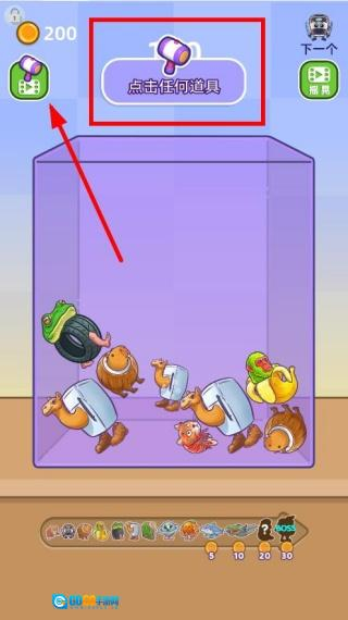4、当屏幕上出现 “点击任何道具” 的提示时,点击游戏界面左上角的道具图标,这样就能触发道具功能。借助该功能,你可以快速清理容器内的元素,或者助力合成操作,从而推动游戏进程。