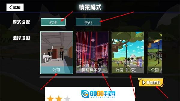 2. 在情境模式选择页面,能够选择标准模式或者挑战模式,接着选取公司类地图开启战斗。