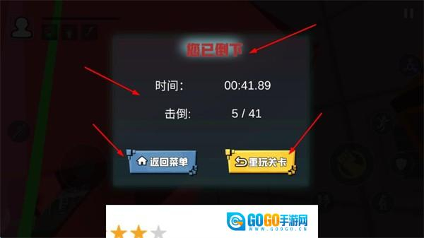4、要是战斗失败,会显示“您已倒下”,同时可查看耗时、击倒数等数据。此时,您可以选择重玩关卡,通过优化操作来提升战绩;也可以返回菜单,更换模式后再次挑战。