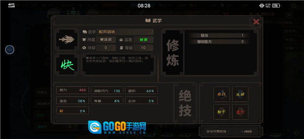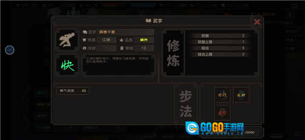 天赋选择 +5御剑、+10防御以及600内力,接着进行新手引导。打开行囊,学习初始武学,包括微势、轻功、内功和剑法。在右下角的蓝色大圆盘处进行躲避飞剑修炼,选择修炼5天,只要坚持26秒,就能获得1000多武学经验,同时轻功加速,招架还会生成保护罩,我认为这是获取武学经验最快的方式。之后把这3个武功练满。