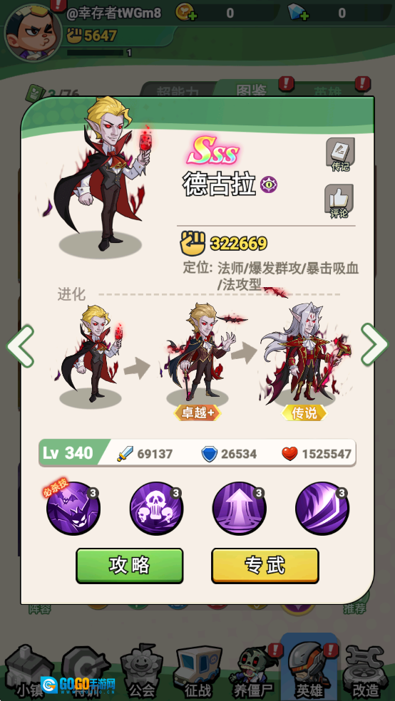 定位:法攻型法师,擅长爆发群攻,具备暴击吸血能力。 技能特色:可释放强力范围法术,对大面积区域造成伤害,还拥有暴击回血机制,战斗中越战越勇。在应对群体敌人时优势显著,堪称清理密集僵尸潮的不二之选。