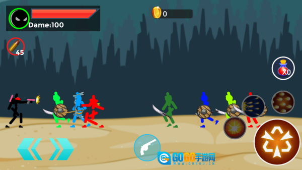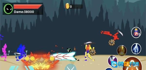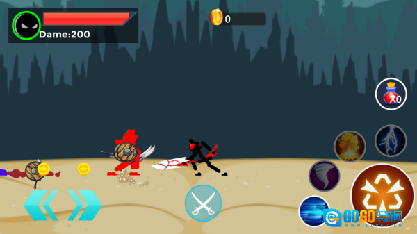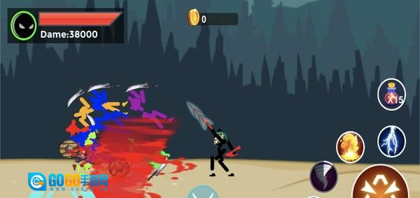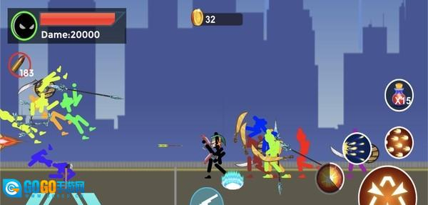 2、通过左侧方向键来操控火柴人的移动与攻击方向,右侧按键主要承担普通攻击以及释放各类炫酷技能的职责,巧妙地将这些操作灵活组合,便能形成威力惊人的连招。