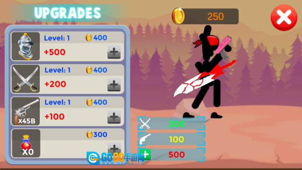 4、在完成关卡挑战后所获取的金币,能够用于提升火柴人的各项属性,其中涵盖增强护甲的防御能力以及强化武器的攻击威力。
