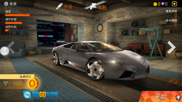 1. 玩家进入游戏主界面后,能够点击画面左右两侧的箭头按钮,以此来切换汽车,随后点击“开始”即可进入比赛。