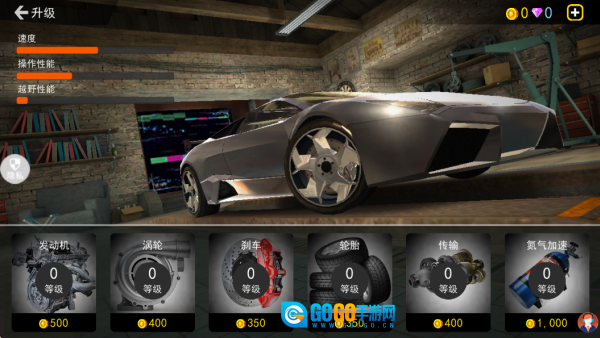 2. 除此之外,于主界面的升级面板里,玩家能够耗费金币对汽车的各个部位进行升级,以此提升属性能力。