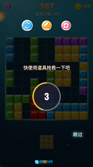 4. 如图所示,当无法再放置新方块时,挑战即宣告结束。此时可使用道具挽救局面,若没有道具,挑战便会结束,同时记录下你的最高分。