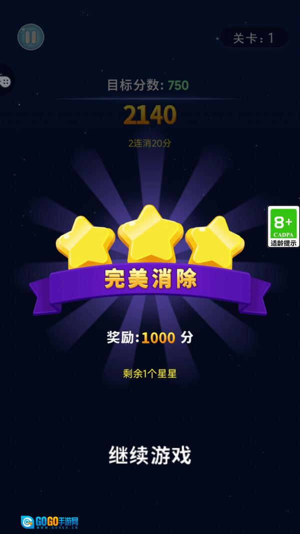 2、拿完美消星星来说,要明确当前关卡的目标分数,比如关卡1的目标是750分,然后朝着通关目标去推进。