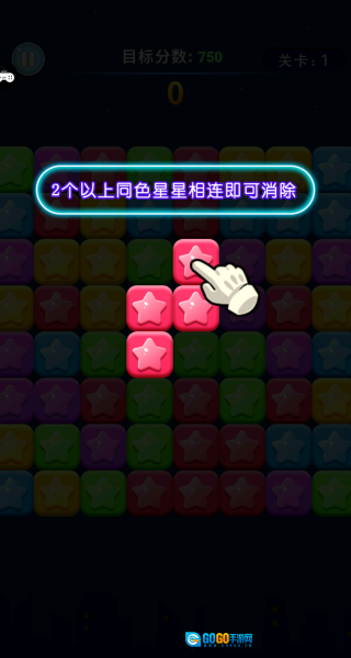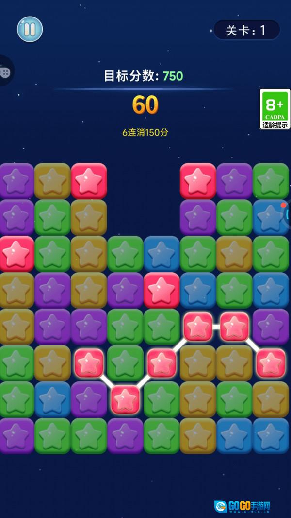 3、依据规则,通过手指点击或者滑动,将2个及以上相同颜色的星星连接起来,从而触发消除效果,进而积累得分。
