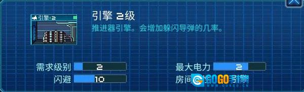 引擎的功能在于躲避对方导弹、黑超武、海盗飞机以及火鹰飞机的攻击。此设施对房间等级与船员加成的依赖程度极高,并且必须持续供电。(若要实现100%闪避,需2个满电的满级引擎,同时还需工程值总计达200的工程人员原地驻守)在前期,这类威胁基本不存在,而且敌方
