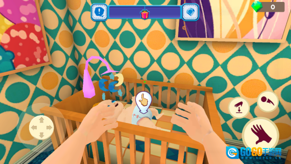 2. 靠近婴儿床,点击互动按钮把宝宝抱起来,借助摇晃与喂食来安抚宝宝的情绪。