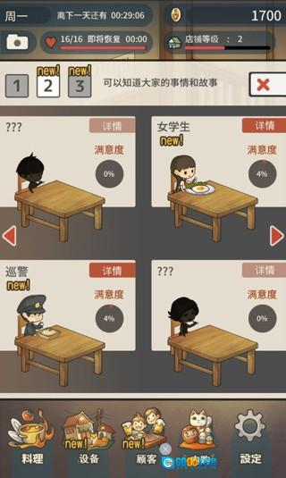 当顾客品尝了料理后,他们的满意度会随之提升,而满意度提升后还会触发对话。在游戏里,金币主要用于购置店内设备,像能提高制作料理总上限的料理放置台,可增加店内就餐顾客人数上限的餐桌,以及冷藏库、收银机等提升各项属性的道具。进入店内的每一位食客都有自己偏爱的独特料理,通过不断吸引食客前来用餐,进而提升每个食客的满足度。随着满足度的增长,会触发不同食客的特殊对话剧情。