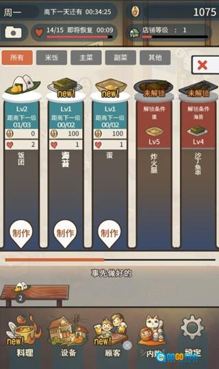 游戏刚开始时,会有新顾客前来。在游戏初始阶段,因为仅有一张料理存放台,所以能够为客人们制作饭团、海苔、蛋这三种食物中的两种。游戏开始时拥有的金币数量为1000,体力值是15,店铺等级为1级。