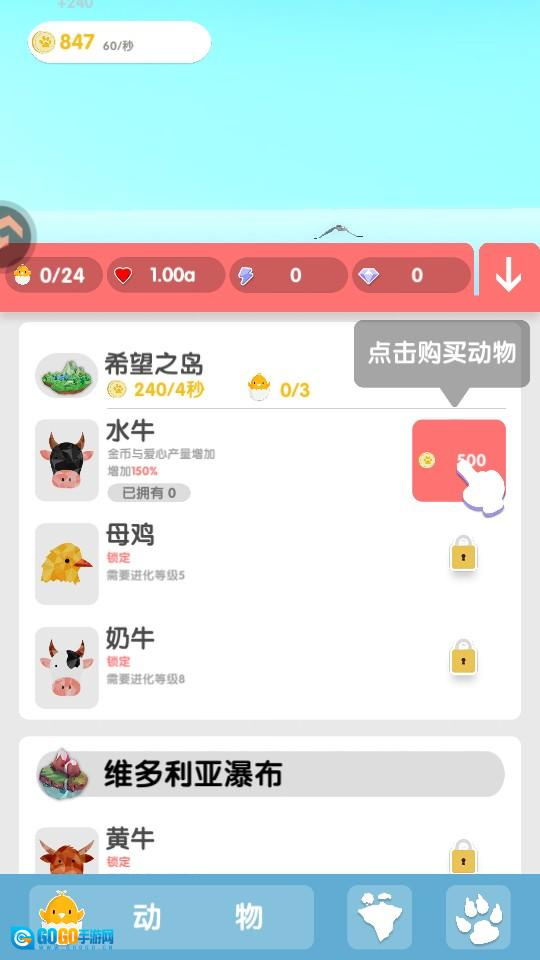 3、当拥有充足金币时,我们便能够购买动物,如此一来,不仅能提高岛屿的金币与爱心产出量,还能为岛屿增添生机活力。