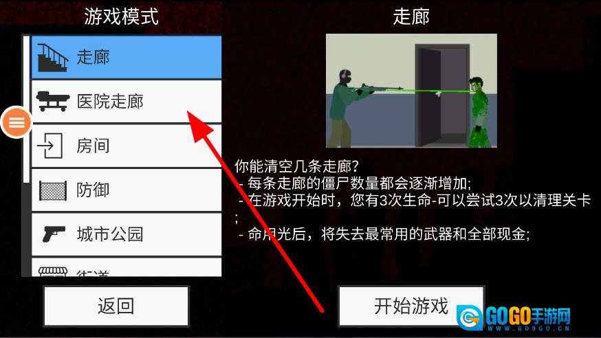 1. 进入游戏之际,首先要挑选游戏模式,比如走廊、医院走廊这类不同的场景模式,确定好之后点击“开始游戏”,随即进入相应场景,展开僵尸对抗。