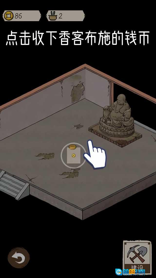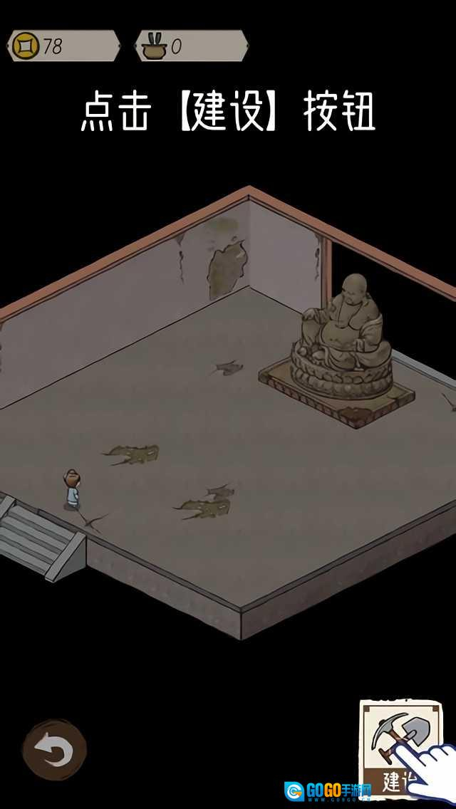 2、静静等候香客步入天王殿内,当看到天王殿内部破败不堪时,可点击【建设】按钮来优化天王殿的环境。