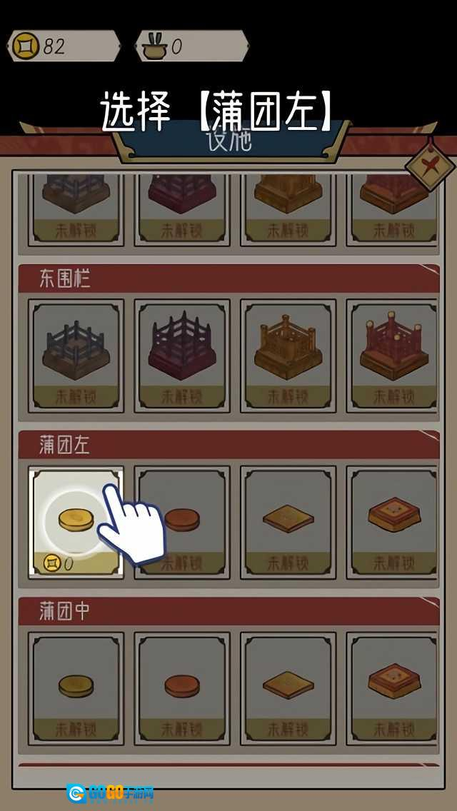 3、在此处可挑选蒲团、围栏、佛像等各类道具,只是前期钱币不足,仅能购置蒲团。