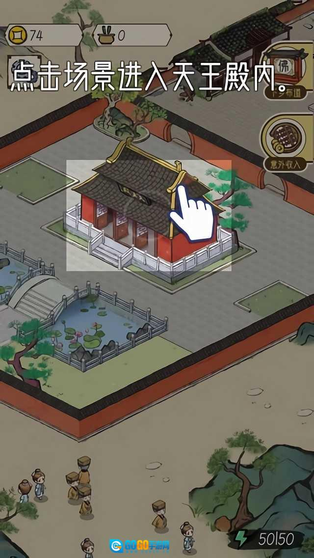 4、再次踏入天王殿内,便能瞧见香客们正虔诚地拜佛。待香客离去后,会留下一些钱币,点击这些钱币,就能收下香客布施的钱财,为寺庙积攒香火钱。要知道,这些香火钱对寺庙日后的发展起着至关重要的作用,务必好好珍惜。