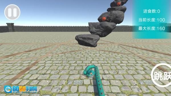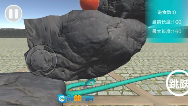 4、轻点右侧专门设计的跳跃按钮,就能控制小蛇跳上岩石,摘取高处的新鲜苹果。