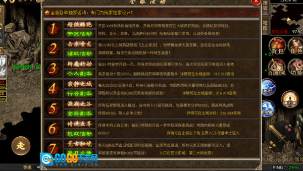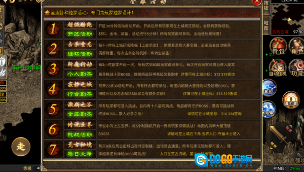 3、斩魔行动:副本每3小时开启一次,80级及以上玩家均可参与。玩家最多能挑战十层BOSS,越级挑战可获取高级装备。