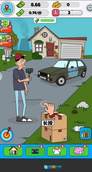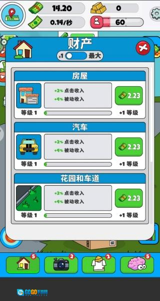 4、于财产界面里,针对房屋、汽车、花园以及车道等资产展开升级操作。此类升级可同步提高点击收入与被动收入,乃是达成财富持续增长的关键策略。