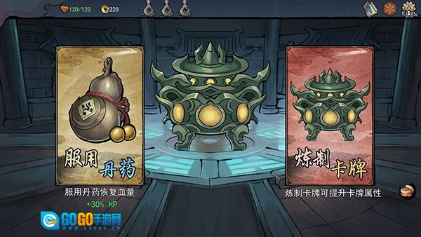 丹炉图标对应的功能是炼丹,简单来讲这里就相当于一个休息点,你既可以选择恢复自身的血量,也能够对卡牌进行强化操作。