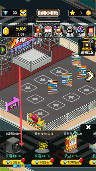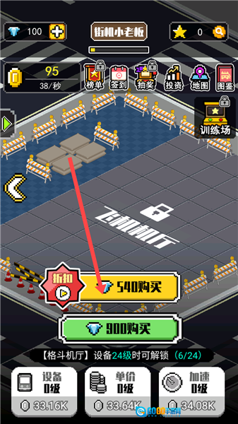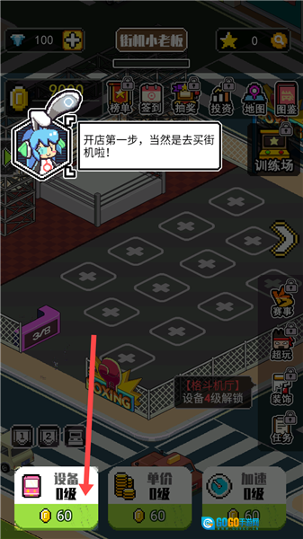 2游戏启动后会引导你完成开店的首个步骤——添置街机设备。你需要在界面底部找到标有“设备0级”的按钮并点击,消耗60枚金币来购入初始的运营设备,这样就能正式开启你的经营之旅了。