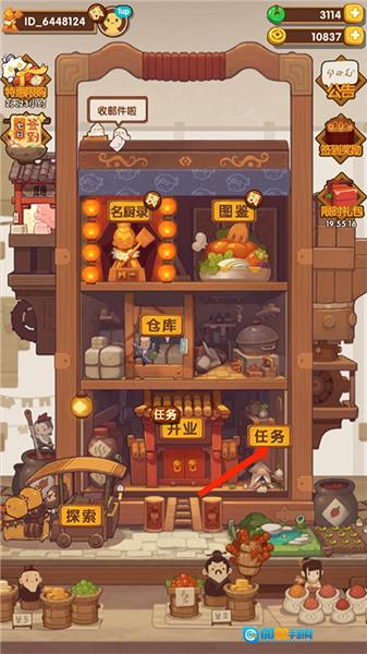 1、打开爆炒江湖游戏,进入游戏主界面,可看到【名厨录】、【图鉴】、【仓库】、【开业】、【探索】和【任务】等项目,