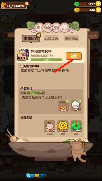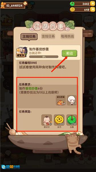 7、进入任务界面,包括主线任务、支线任务和每周挑战,可看到当前的任务的制作番茄炒鸡蛋,还有任务要求和任务奖励,点击【前往】选项,