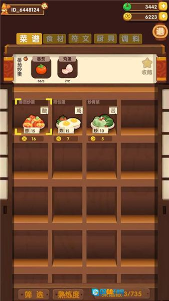 4、进入仓库界面,分为菜谱、食材、符文、厨具和调料等,可以看到相应的获取方法,