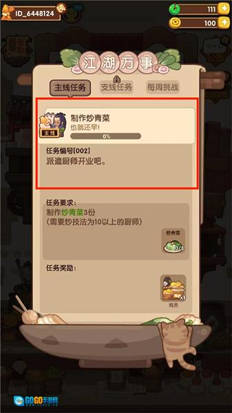 在《爆炒江湖》中,最主要的主线任务就是需要“经营”饭店,需要玩家制作某道菜,几个品级的菜,或者是使用某种技能炒菜,使用特定的厨师做菜……经营内容丰富多样,帮助玩家进一步提升自己的技能,吸引客人来客栈吃饭。