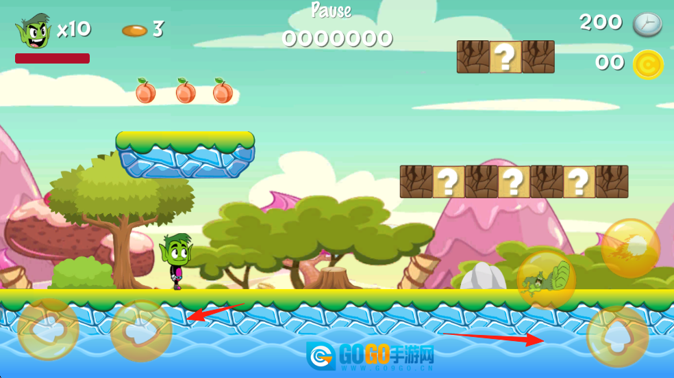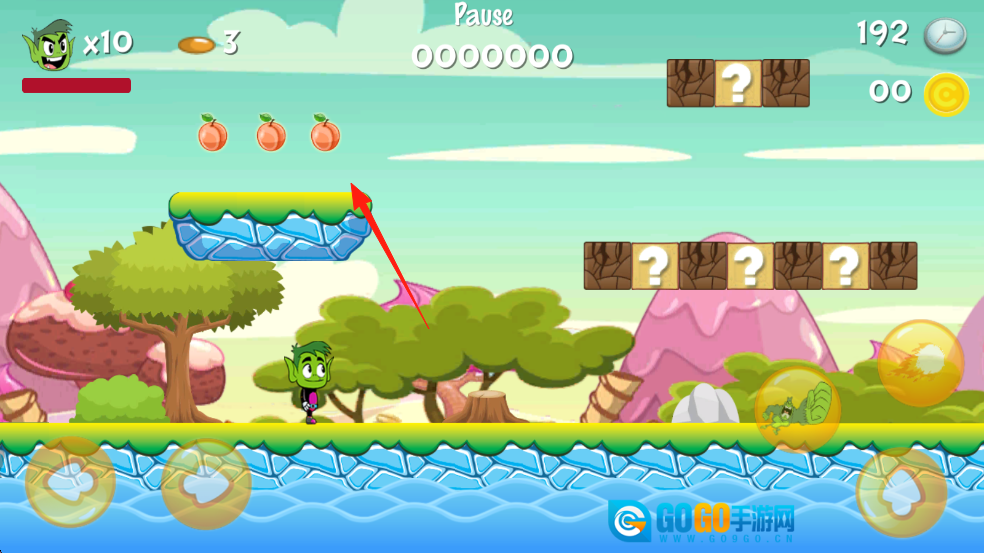 当看到带有红色箭头标识的冰块平台时,按下同样有红色箭头标记的跳跃按钮,借助跳跃动作登上该平台,在此过程中获取桃子类道具,并触发带有问号的砖块以解锁相应奖励。
