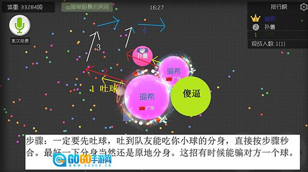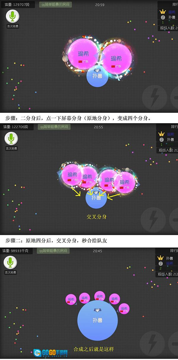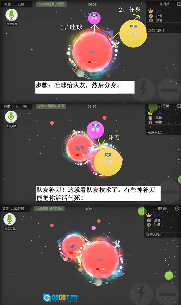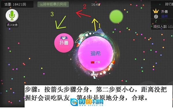3、小球绕圈秒合。当处于被敌人压制的局面时,先向队友吐球,在确保分身不会吞噬队友的时机,迅速绕圈完成秒合操作。